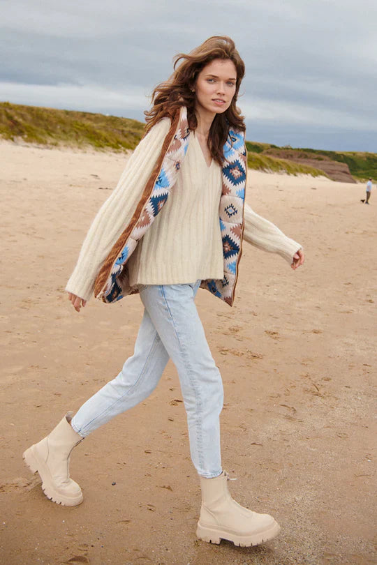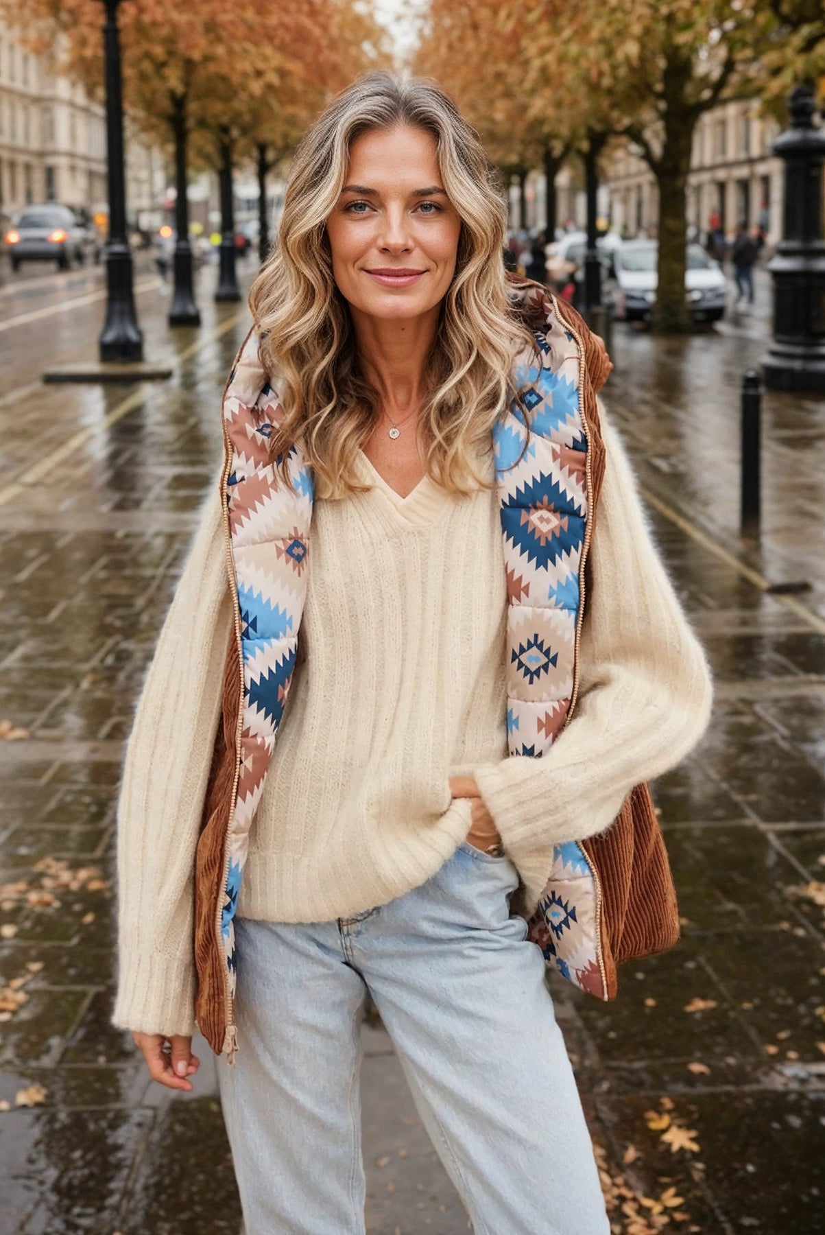 Z czym nosić kamizelkę Caramel Latte? Beżowy bezrękawnik oni sztruksu, dzięki azteckiemu wzorom, jest ubraniem na tyle ciekawym i wyrazistym, że nie istnieje wiekiej zastosowania. Do tego można uzyskać proste, jednolite ubrania współgrające kolorystycznie z kamizelką. Naszą propozycją jest kremowy sweterek i klasyczny, niebieski jeans.