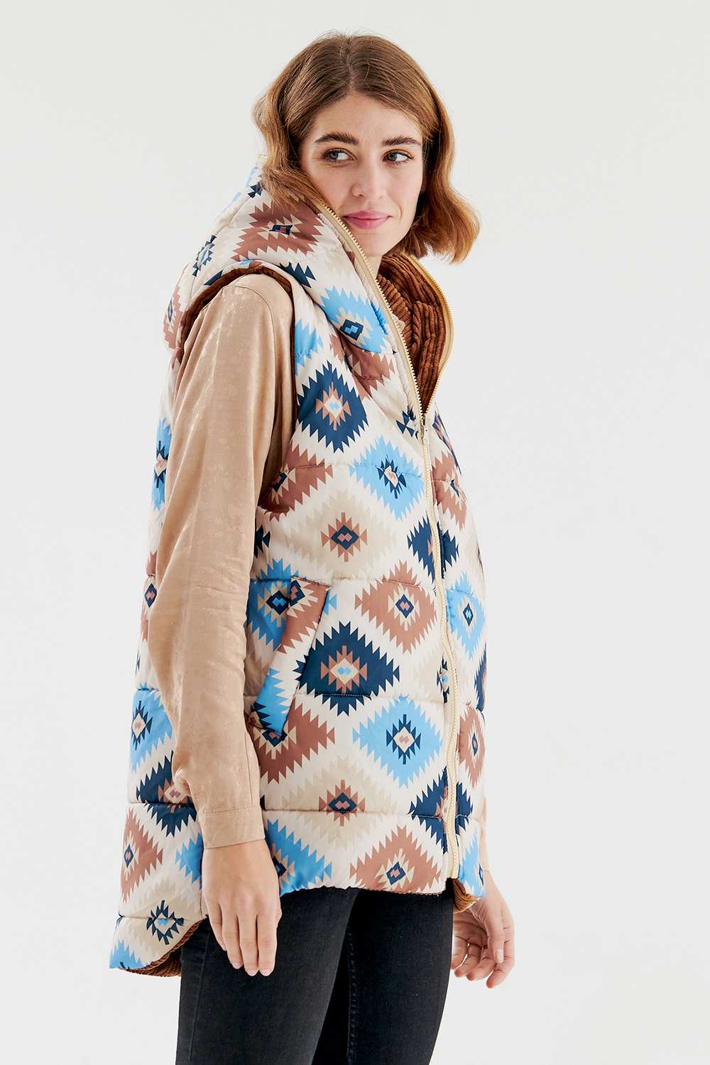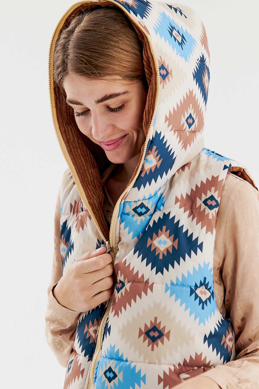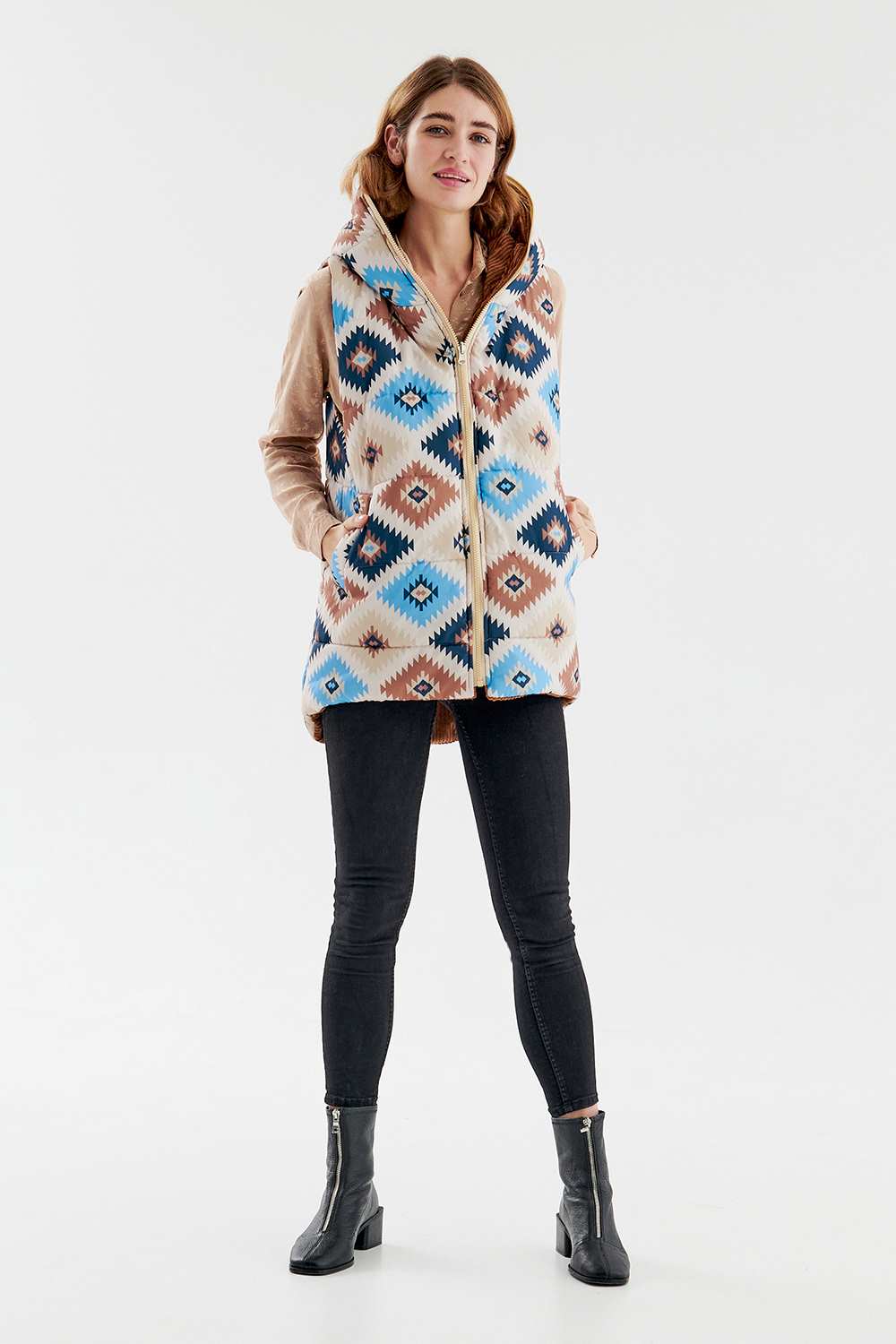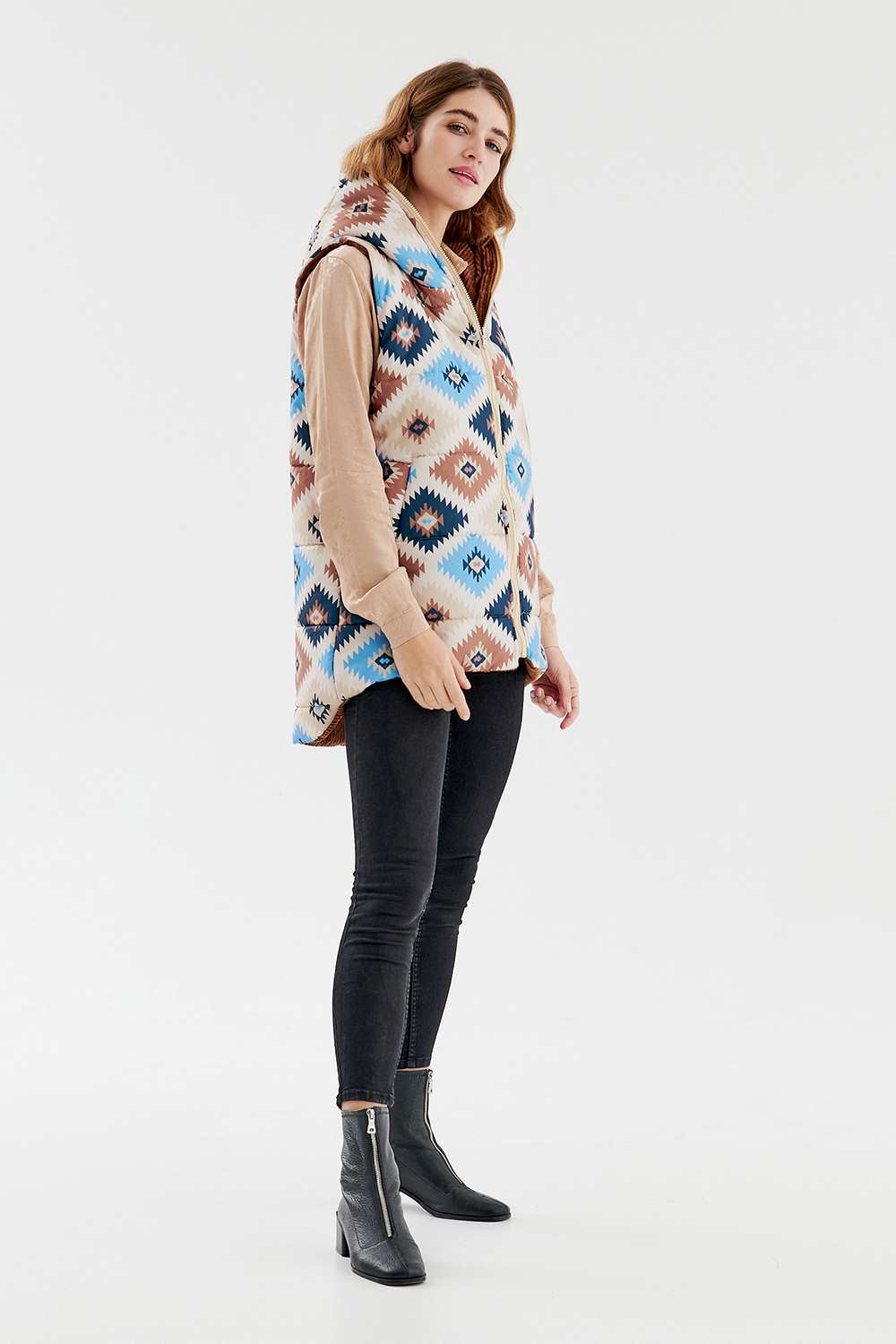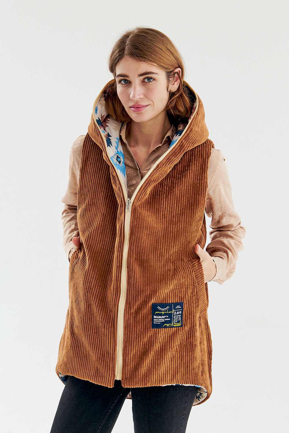 Karmelowa kamizelka posiada dwie użytkowe ubrania, co czyni ją niezwykle praktycznym ubraniem. Jedna sztruksowa część w kolorze karmelu, druga w oryginalnych brązowo-niebieskich wzorach przysuwających się na myśl aztecką symbolikę. Będziesz mógł z niego skorzystać w swoim czasie i wykorzystać go jako punkt wyjścia. Możliwość noszenia kamizelek na dwa sposoby, które są stosowane z doskonałym ubraniem na wyjazd. Pakując do walizki tę jedną rzecz, zyskując dwa odmienne stroje. Takie lifehacki zawsze doceniamy.