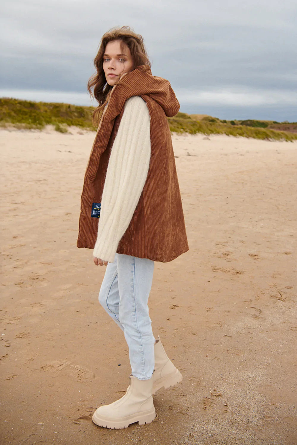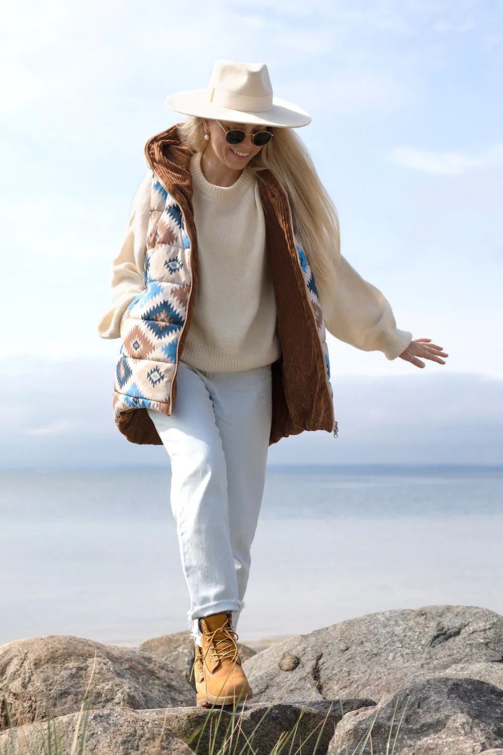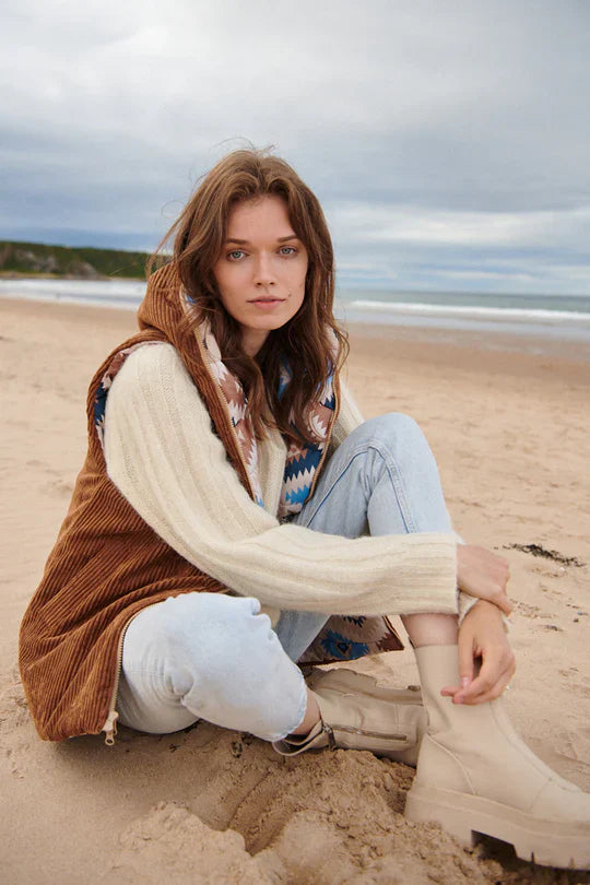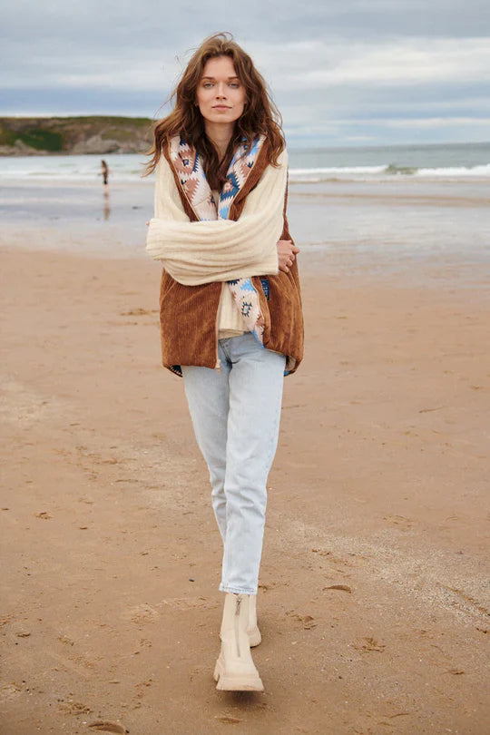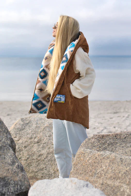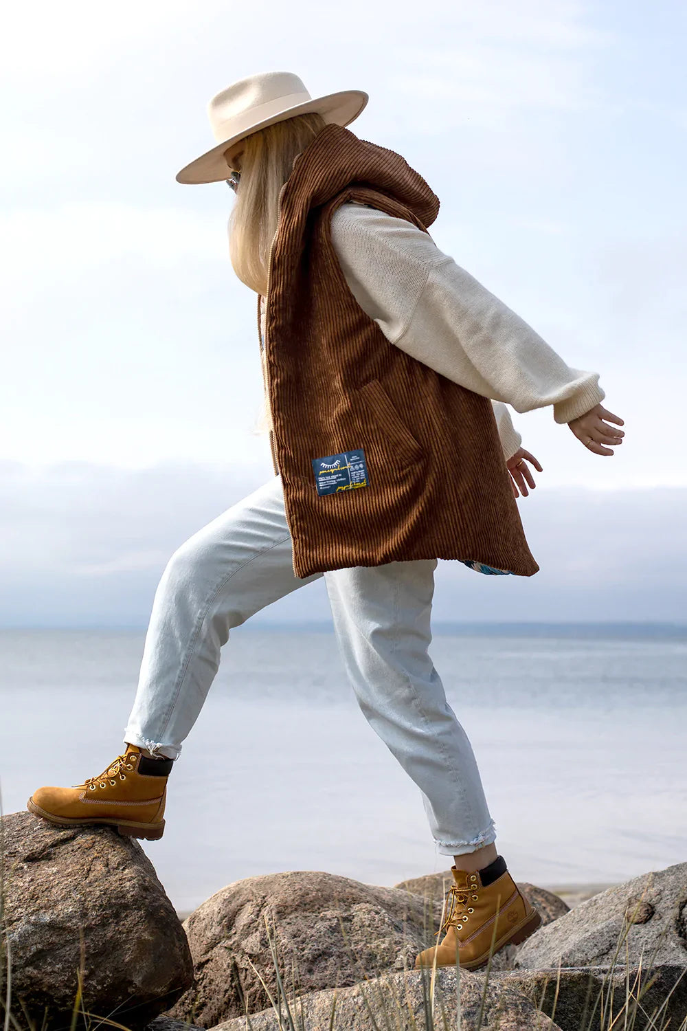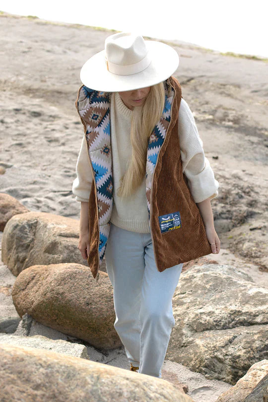 Karmelowa kamizelka posiada dwie użytkowe ubrania, co czyni ją niezwykle praktycznym ubraniem. Jedna sztruksowa część w kolorze karmelu, druga w oryginalnych brązowo-niebieskich wzorach przysuwających się na myśl aztecką symbolikę. Będziesz mógł z niego skorzystać w swoim czasie i wykorzystać go jako punkt wyjścia. Możliwość noszenia kamizelek na dwa sposoby, które są stosowane z doskonałym ubraniem na wyjazd. Pakując do walizki tę jedną rzecz, zyskując dwa odmienne stroje. Takie lifehacki zawsze doceniamy.