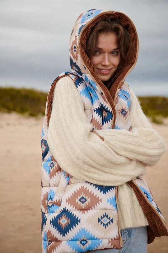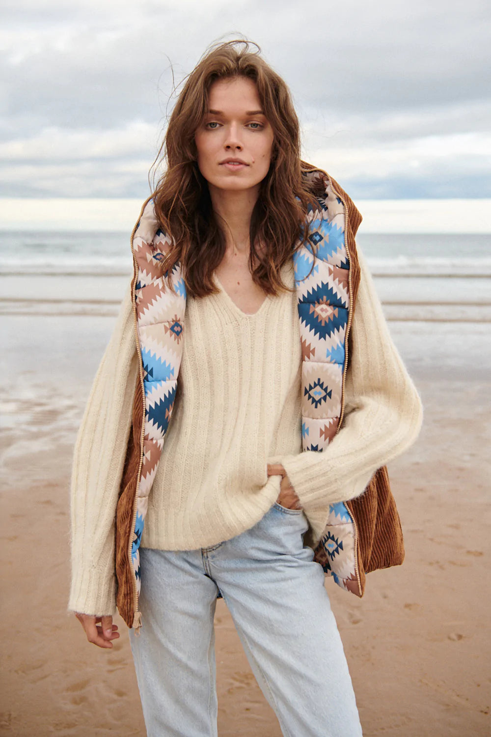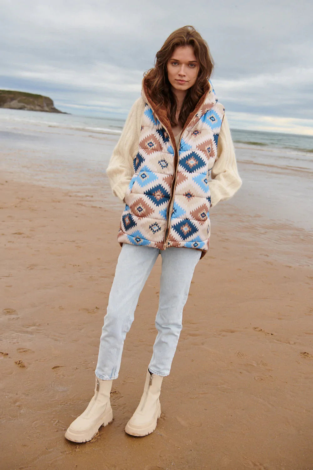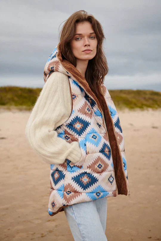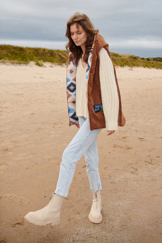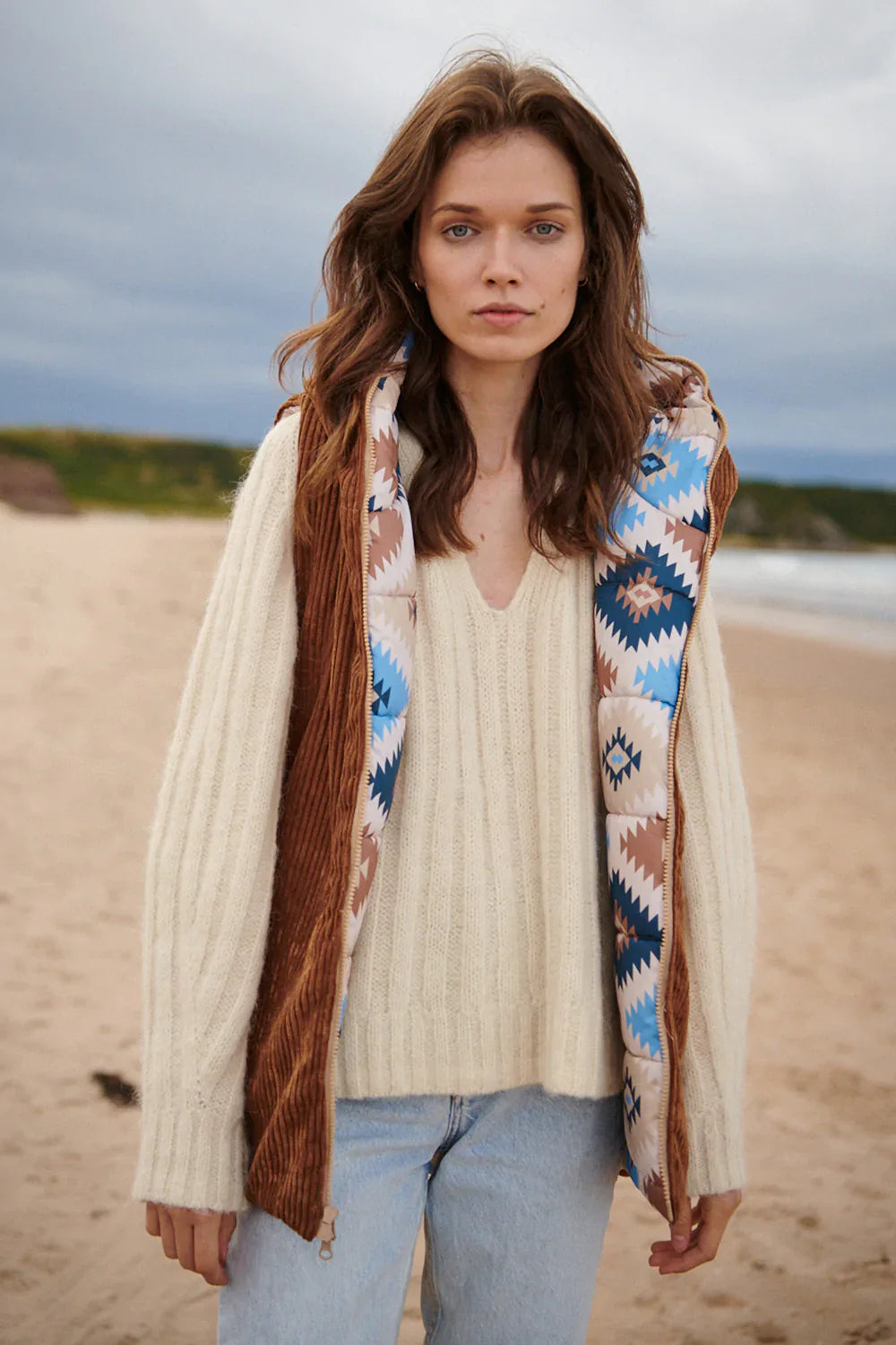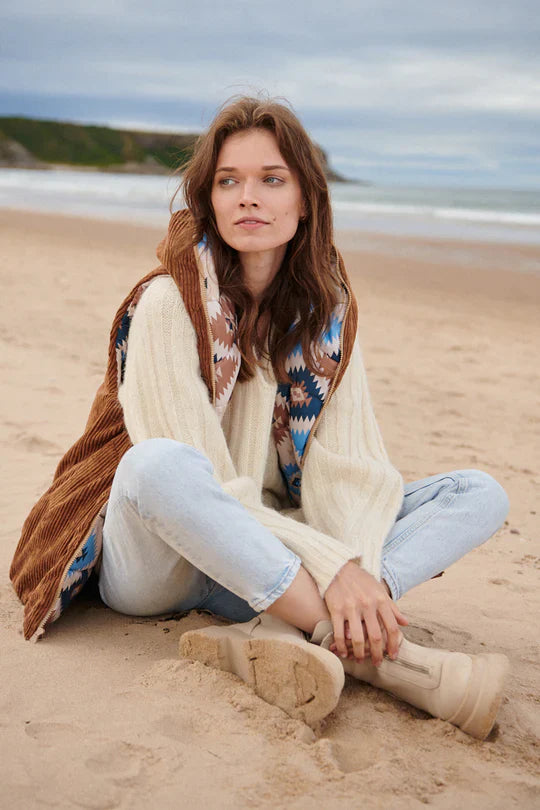 Karmelowa kamizelka posiada dwie użytkowe ubrania, co czyni ją niezwykle praktycznym ubraniem. Jedna sztruksowa część w kolorze karmelu, druga w oryginalnych brązowo-niebieskich wzorach przysuwających się na myśl aztecką symbolikę. Będziesz mógł z niego skorzystać w swoim czasie i wykorzystać go jako punkt wyjścia. Możliwość noszenia kamizelek na dwa sposoby, które są stosowane z doskonałym ubraniem na wyjazd. Pakując do walizki tę jedną rzecz, zyskując dwa odmienne stroje. Takie lifehacki zawsze doceniamy.