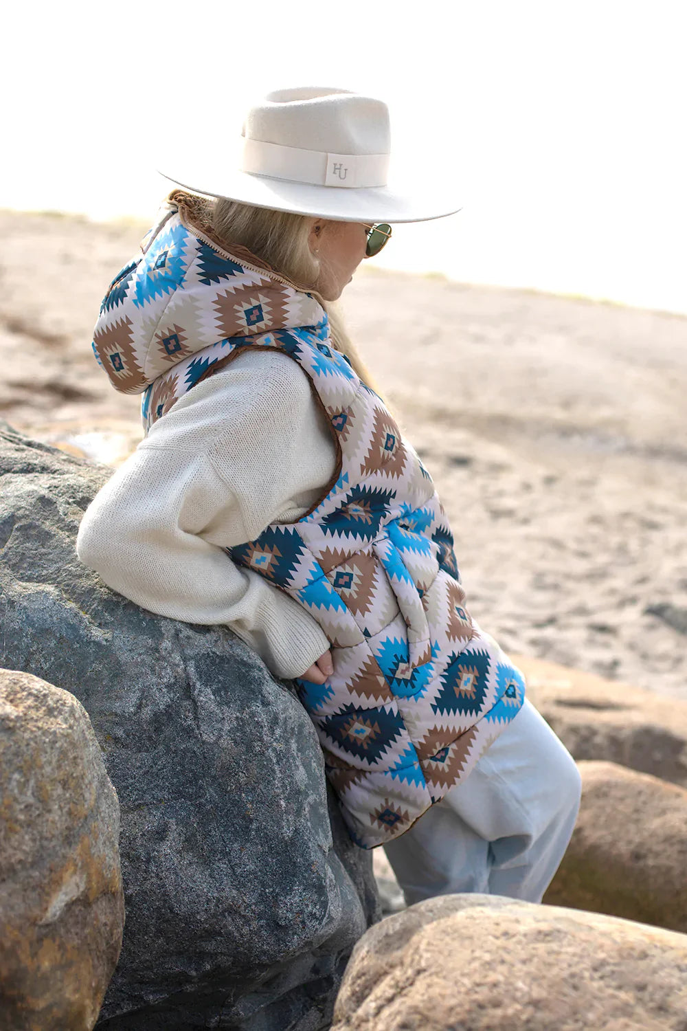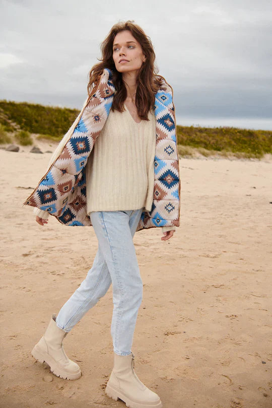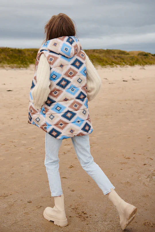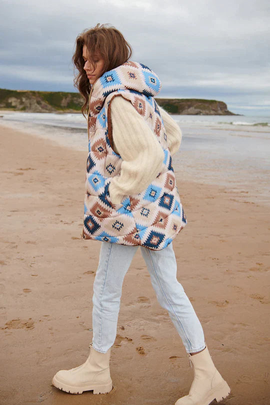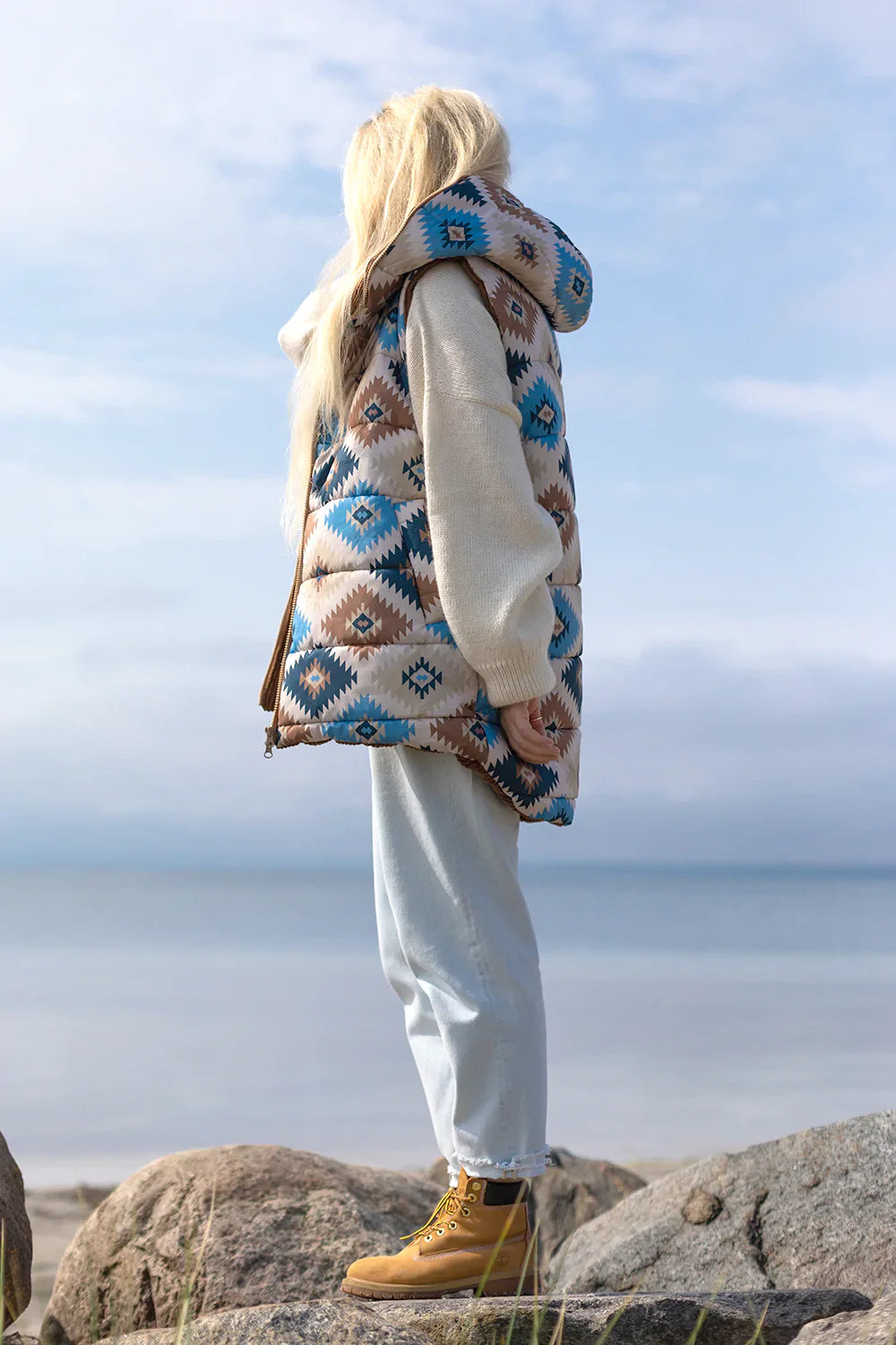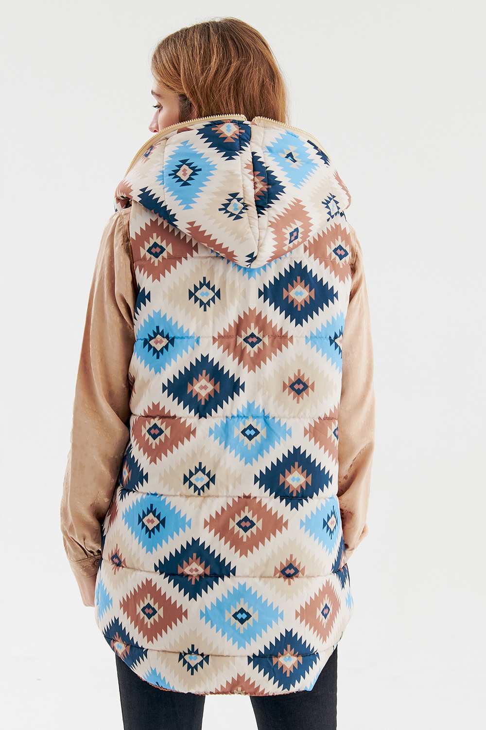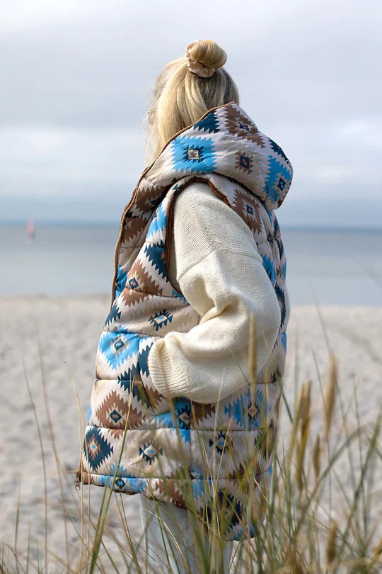 Karmelowa kamizelka posiada dwie użytkowe ubrania, co czyni ją niezwykle praktycznym ubraniem. Jedna sztruksowa część w kolorze karmelu, druga w oryginalnych brązowo-niebieskich wzorach przysuwających się na myśl aztecką symbolikę. Będziesz mógł z niego skorzystać w swoim czasie i wykorzystać go jako punkt wyjścia. Możliwość noszenia kamizelek na dwa sposoby, które są stosowane z doskonałym ubraniem na wyjazd. Pakując do walizki tę jedną rzecz, zyskując dwa odmienne stroje. Takie lifehacki zawsze doceniamy.