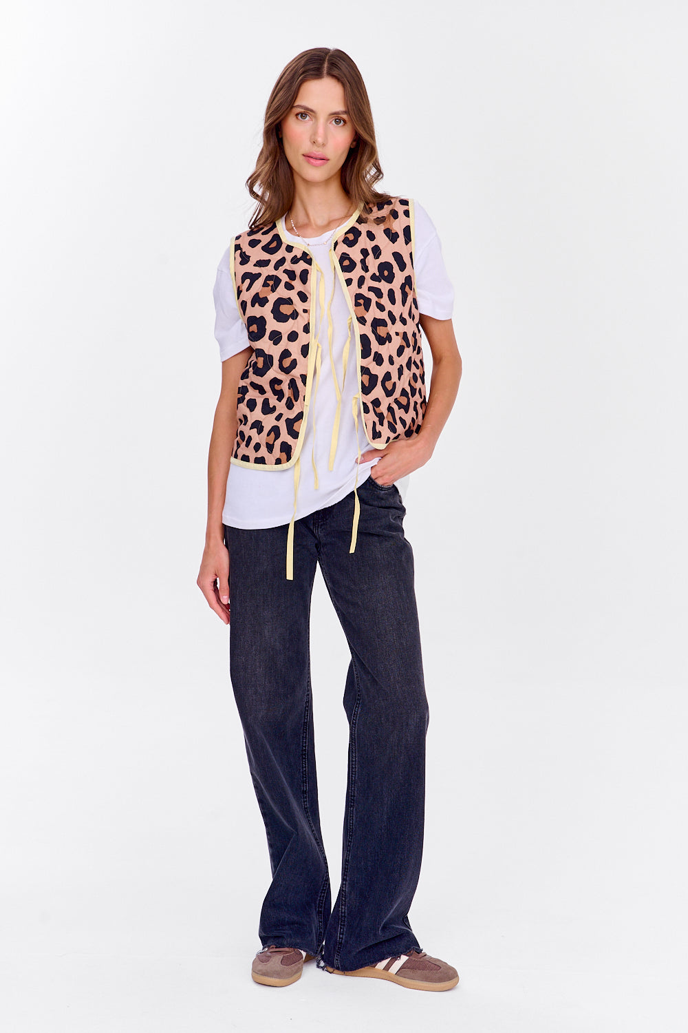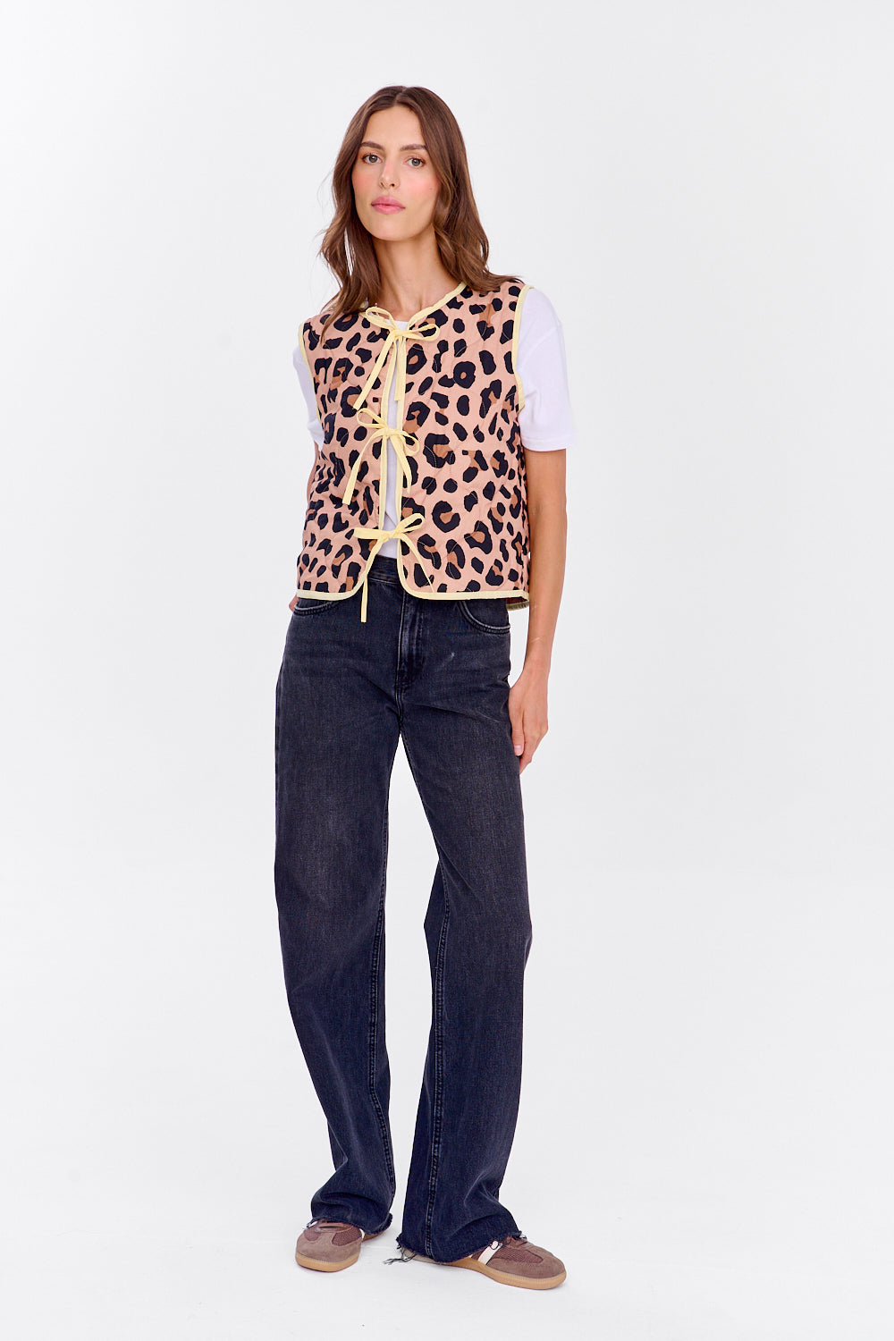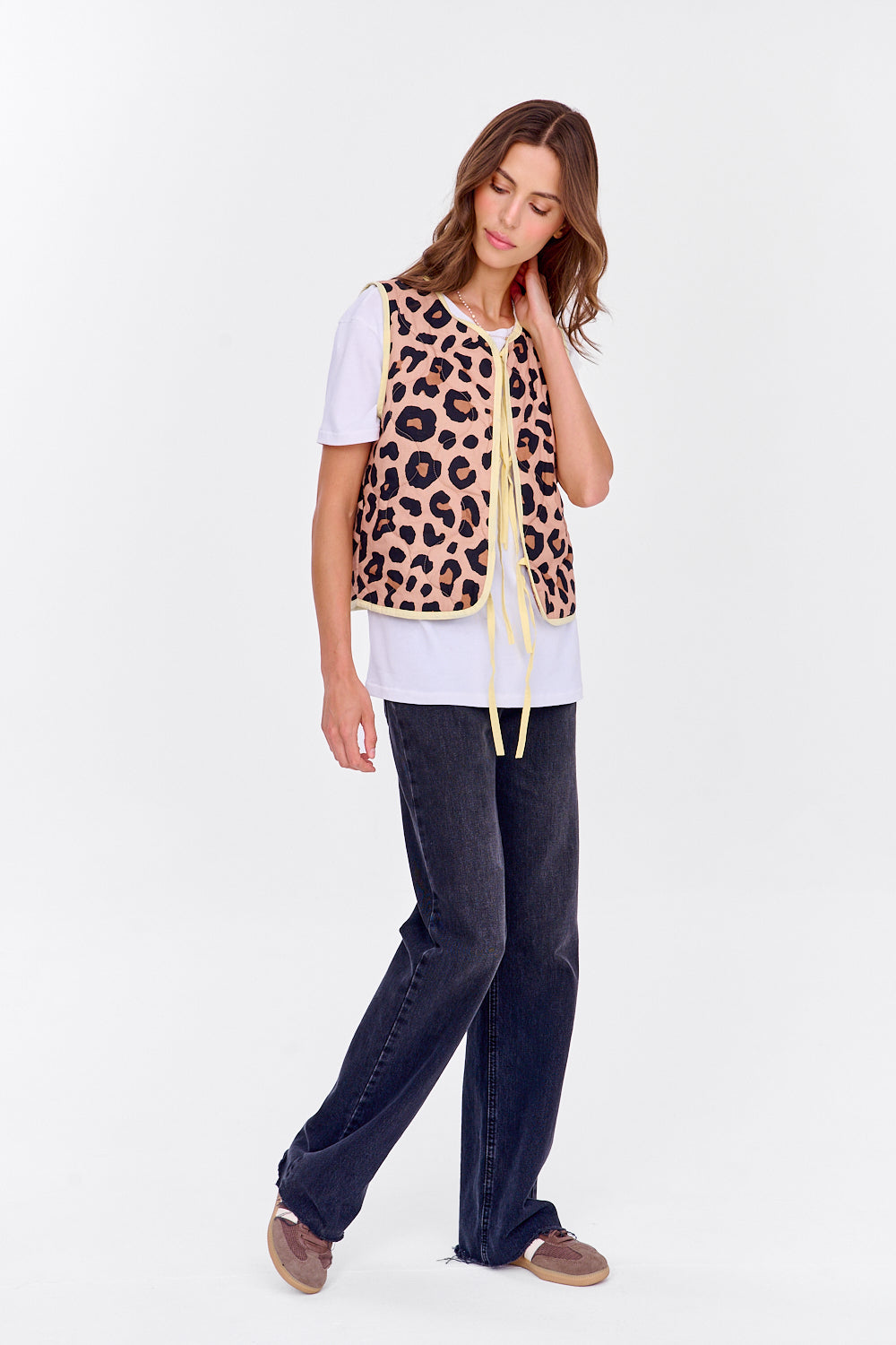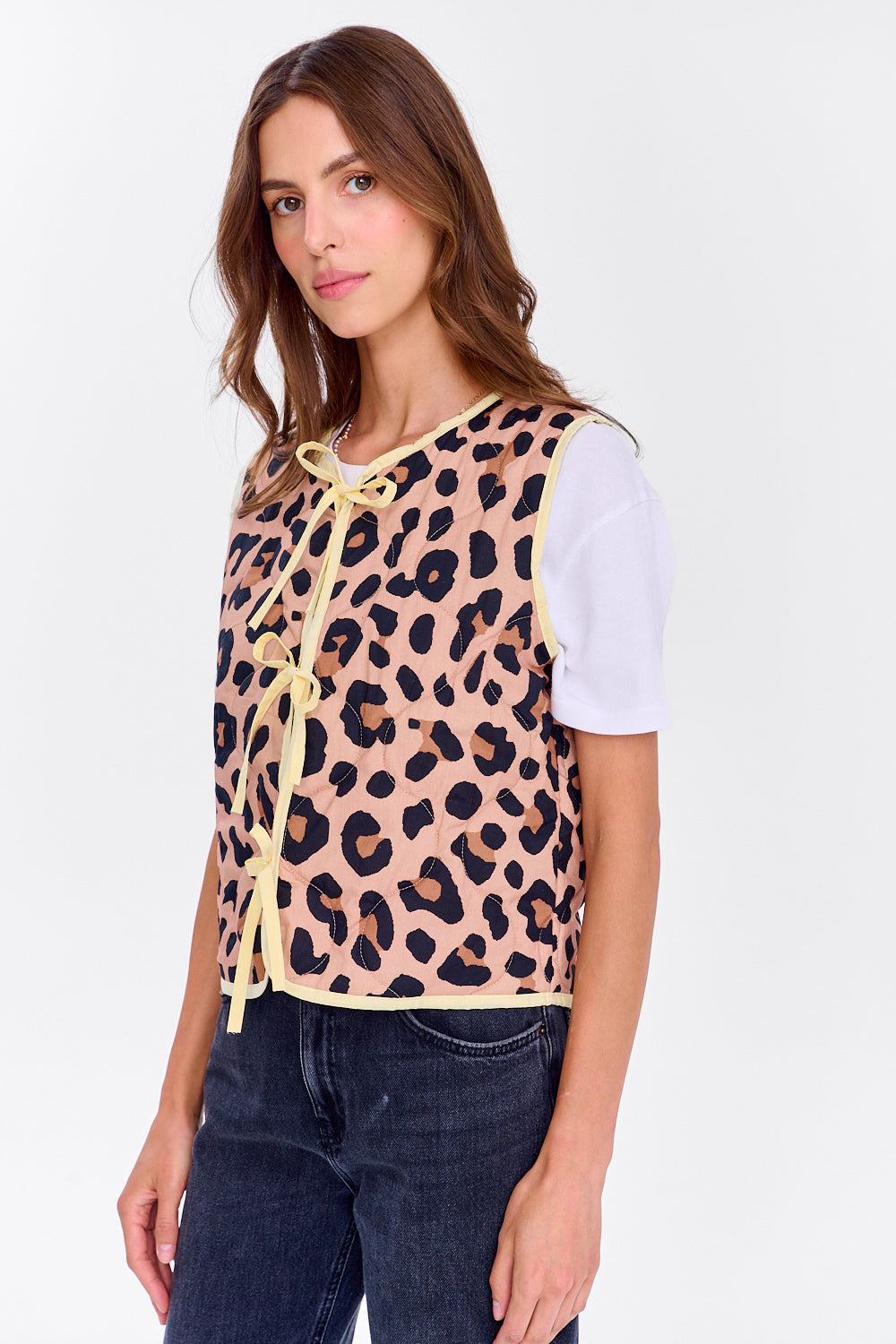 Kamizelka dwustronna Urban Safari do energetycznego połączenia dzikości i komfortu – model dwustronny, który pozwolił na błyskawiczną zmianę charakteru charakteru. Z jednej strony kamizelka zachwycająca efektem printem w cętki, inspirowana dziką naturą, podkreślonym kontrastującym żółtymi lamówkami. Z drugiej strony – stonowany, czekoladowobrązowy odcień z subtelnymi przeszyciami, który pozwala na spojrzenie i pozwala na bardziej klasyczne stylizacje. Obie wersje zawierają praktyczne powiązania z przodu, które podkręcają nonszalancki charakter kamizelki.